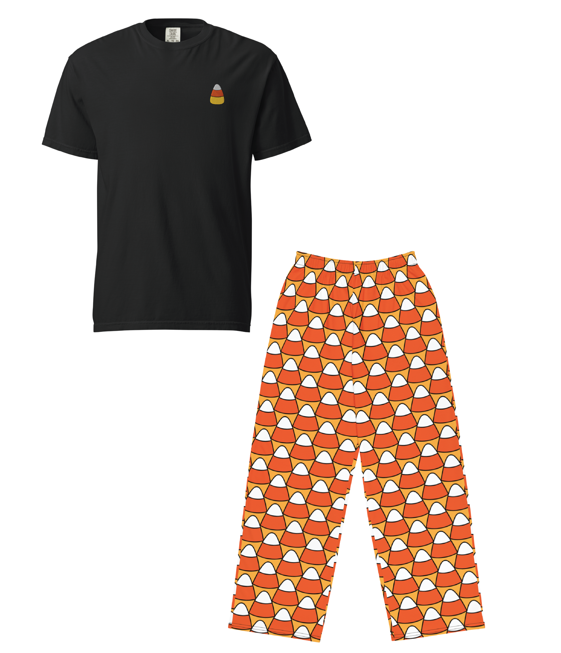 A little sweet, a little silly, a lot of cozy. This matching lounge set features our candy corn embroidered tee and coordinating all-over print pants — perfect for movie nights, candy hauls, or just leaning into the Halloween mood. It’s bold, nostalgic, and unapologetically corn-core.